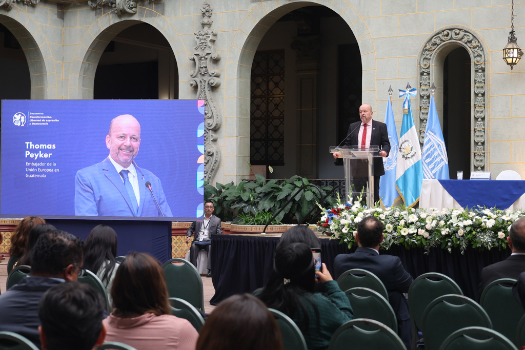 La jornada comenzó con un acto protocolario que reunió a actores institucionales nacionales e internacionales. El embajador de la Unión Europea en Guatemala, Thomas Peyker, alertó sobre la pérdida de confianza en los medios tradicionales y el auge de las redes sociales como principal fuente informativa, incluso entre adultos. “Las redes sociales han sido aprovechadas por actores antidemocráticos para difundir sus narrativas con mínimo esfuerzo y máximo impacto. La desinformación ya no es un fenómeno aislado, sino una estrategia política”.